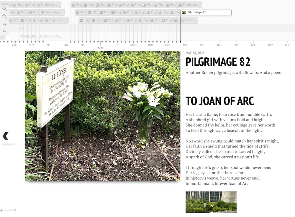 Continuous effort made by people inspired by Jeanne's sacrifice and spiritual journey. From flowers left at her burning site in Rouen, to poetry and more.
